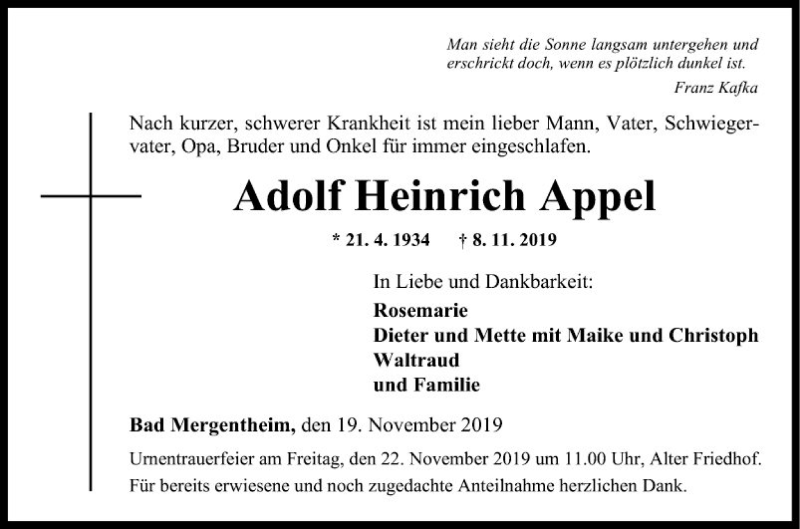Hier finden Sie alle Traueranzeigen aus der Zeitung, die bisher für Adolf Heinrich Appel erschienen sind. Weitere Traueranzeigen, die in der Zeitung erscheinen, werden hier ebenfalls aufgelistet