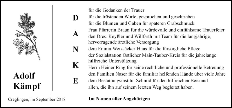 Hier finden Sie alle Traueranzeigen aus der Zeitung, die bisher für Adolf Kämpf erschienen sind. Weitere Traueranzeigen, die in der Zeitung erscheinen, werden hier ebenfalls aufgelistet