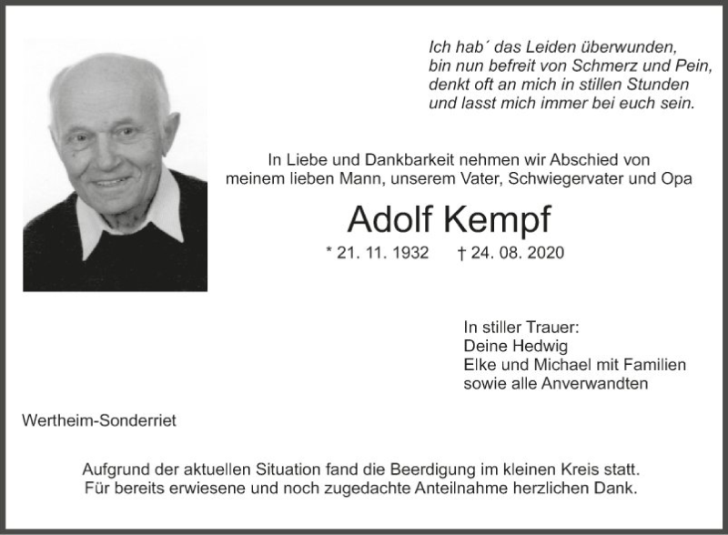 Hier finden Sie alle Traueranzeigen aus der Zeitung, die bisher für Adolf Kempf erschienen sind. Weitere Traueranzeigen, die in der Zeitung erscheinen, werden hier ebenfalls aufgelistet