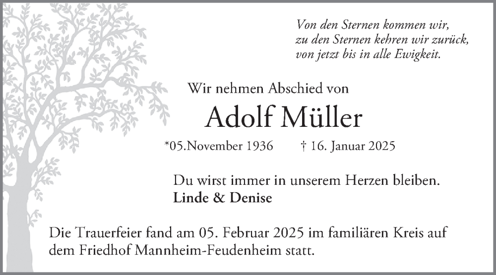 Hier finden Sie alle Traueranzeigen aus der Zeitung, die bisher für Adolf Müller erschienen sind. Weitere Traueranzeigen, die in der Zeitung erscheinen, werden hier ebenfalls aufgelistet