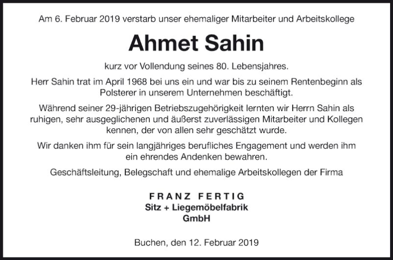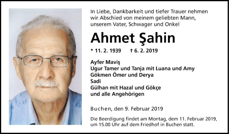 Hier finden Sie alle Traueranzeigen aus der Zeitung, die bisher für Ahmet Sahin erschienen sind. Weitere Traueranzeigen, die in der Zeitung erscheinen, werden hier ebenfalls aufgelistet