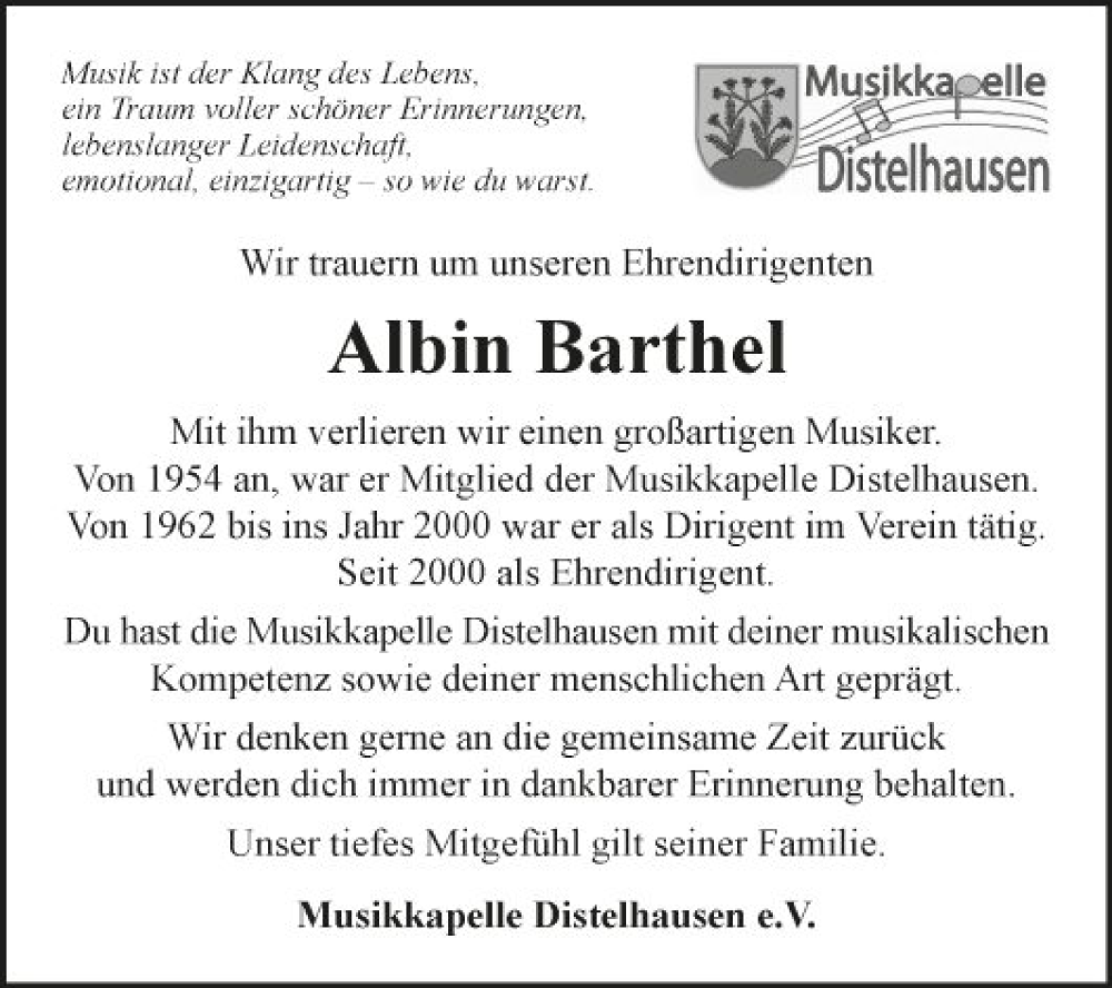 Hier finden Sie alle Traueranzeigen aus der Zeitung, die bisher für Albin Barthel erschienen sind. Weitere Traueranzeigen, die in der Zeitung erscheinen, werden hier ebenfalls aufgelistet