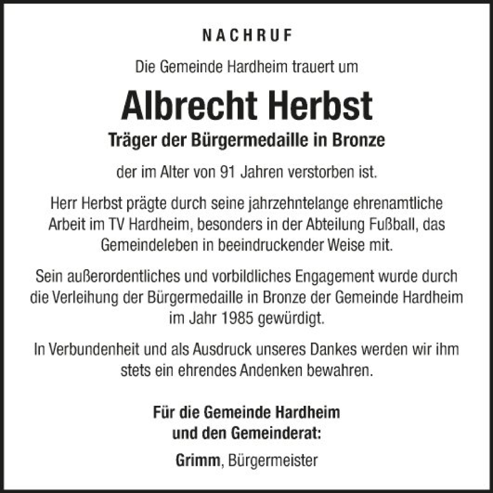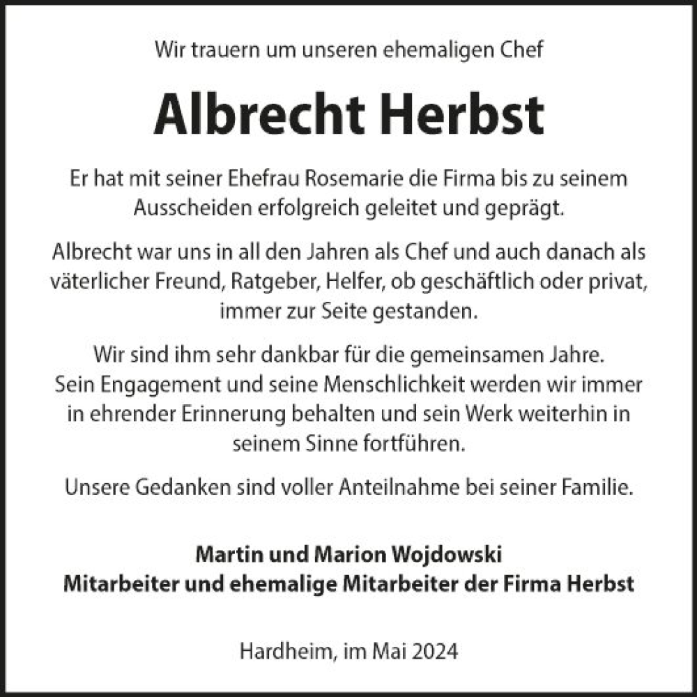 Hier finden Sie alle Traueranzeigen aus der Zeitung, die bisher für Albrecht Herbst erschienen sind. Weitere Traueranzeigen, die in der Zeitung erscheinen, werden hier ebenfalls aufgelistet