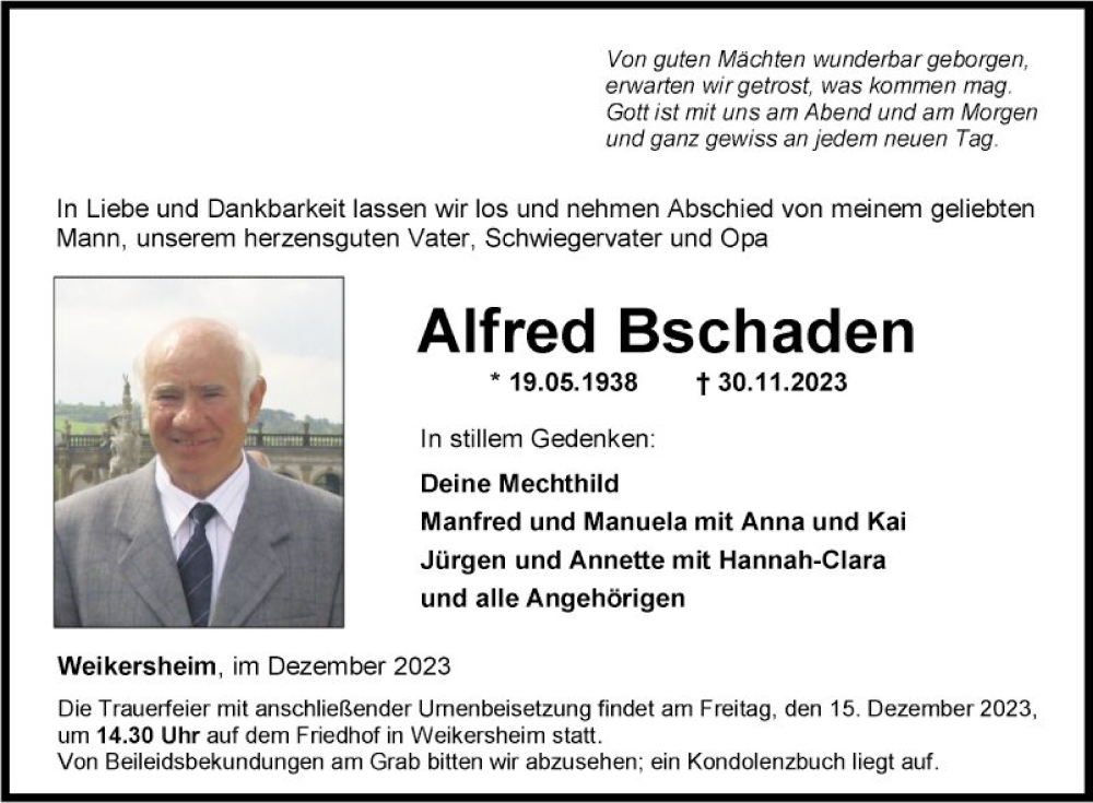 Hier finden Sie alle Traueranzeigen aus der Zeitung, die bisher für Alfred Bschaden erschienen sind. Weitere Traueranzeigen, die in der Zeitung erscheinen, werden hier ebenfalls aufgelistet