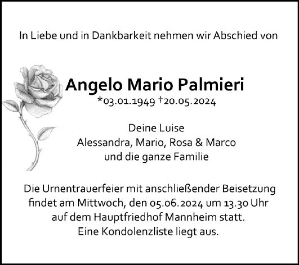Hier finden Sie alle Traueranzeigen aus der Zeitung, die bisher für Angelo Mario Palmieri erschienen sind. Weitere Traueranzeigen, die in der Zeitung erscheinen, werden hier ebenfalls aufgelistet