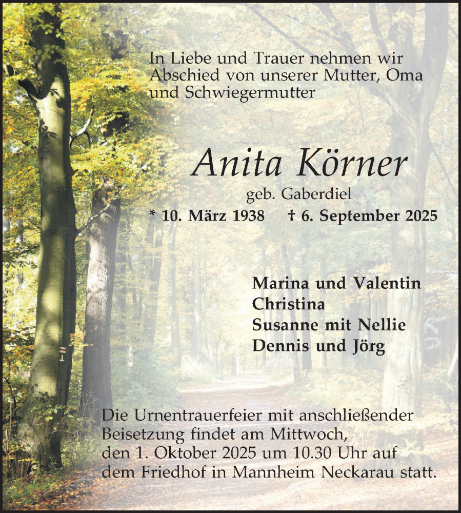 Hier finden Sie alle Traueranzeigen aus der Zeitung, die bisher für Anita Körner erschienen sind. Weitere Traueranzeigen, die in der Zeitung erscheinen, werden hier ebenfalls aufgelistet