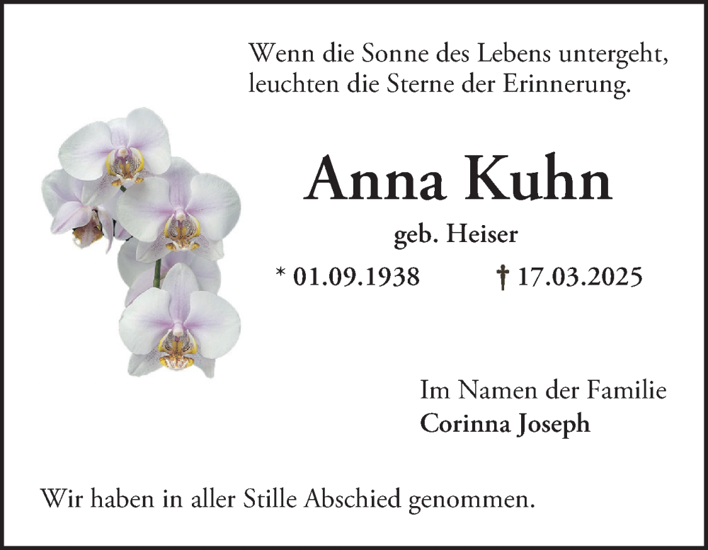 Hier finden Sie alle Traueranzeigen aus der Zeitung, die bisher für Anna Kuhn erschienen sind. Weitere Traueranzeigen, die in der Zeitung erscheinen, werden hier ebenfalls aufgelistet