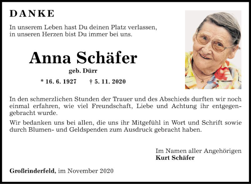 Hier finden Sie alle Traueranzeigen aus der Zeitung, die bisher für Anna Schäfer erschienen sind. Weitere Traueranzeigen, die in der Zeitung erscheinen, werden hier ebenfalls aufgelistet
