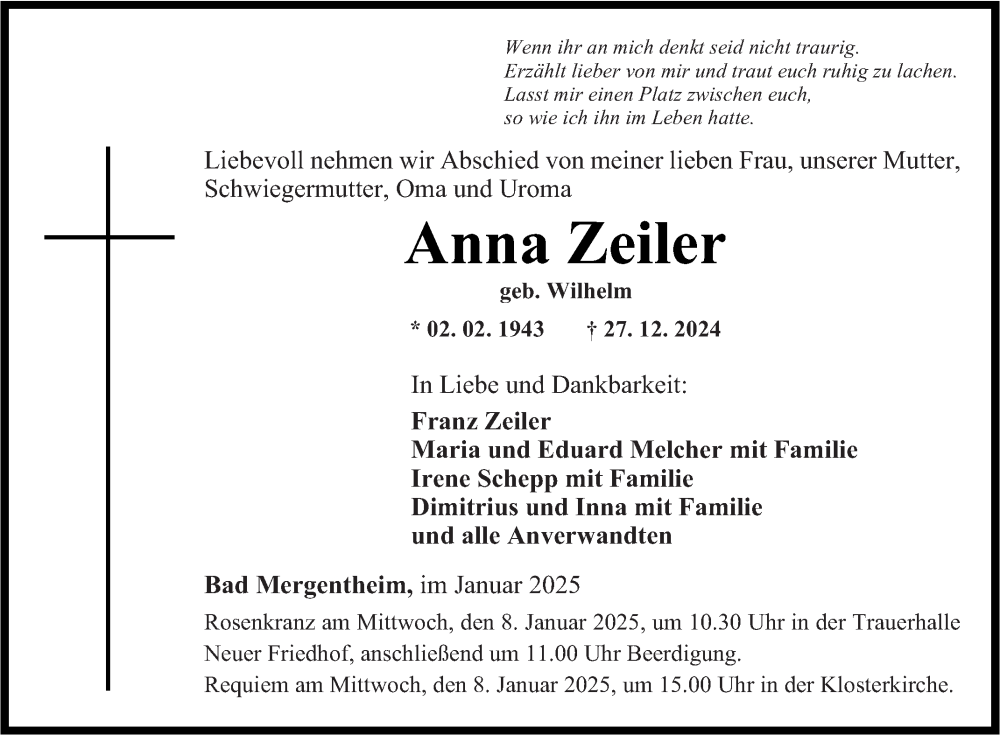 Hier finden Sie alle Traueranzeigen aus der Zeitung, die bisher für Anna Zeiler erschienen sind. Weitere Traueranzeigen, die in der Zeitung erscheinen, werden hier ebenfalls aufgelistet
