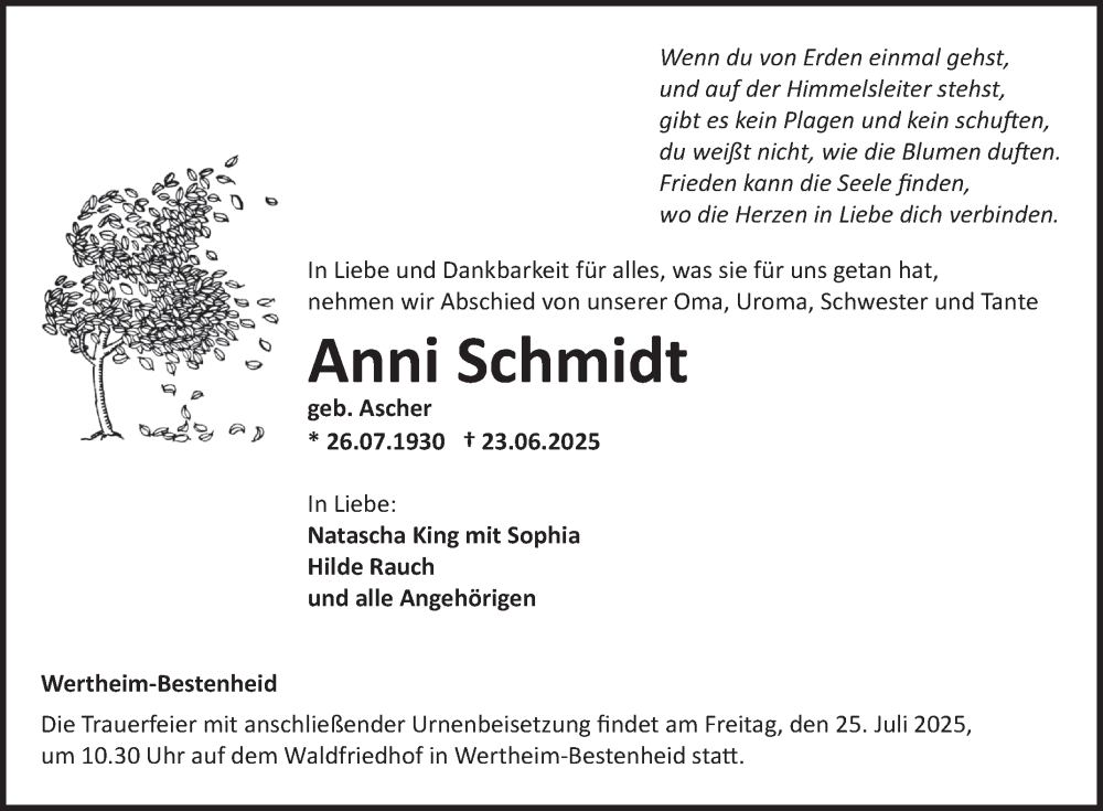Hier finden Sie alle Traueranzeigen aus der Zeitung, die bisher für Anni Schmidt erschienen sind. Weitere Traueranzeigen, die in der Zeitung erscheinen, werden hier ebenfalls aufgelistet