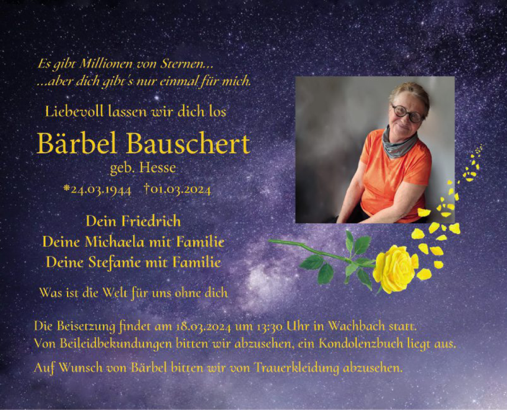 Hier finden Sie alle Traueranzeigen aus der Zeitung, die bisher für Bärbel Bauschert erschienen sind. Weitere Traueranzeigen, die in der Zeitung erscheinen, werden hier ebenfalls aufgelistet