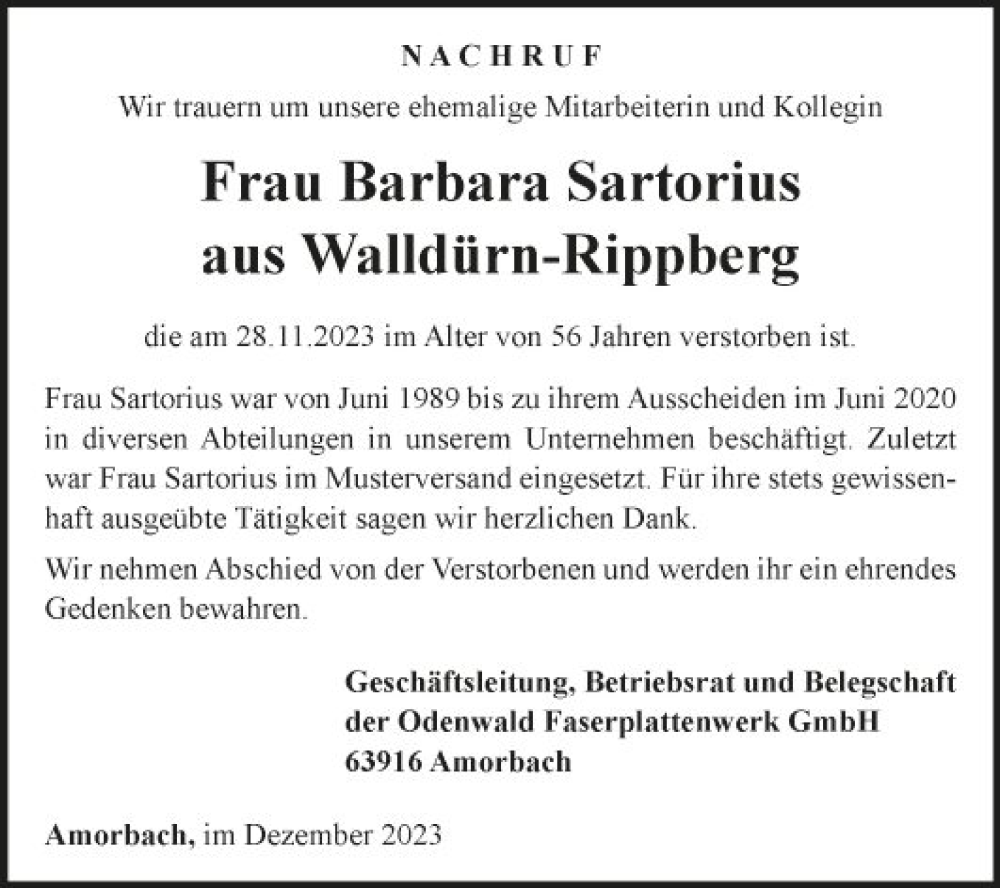 Hier finden Sie alle Traueranzeigen aus der Zeitung, die bisher für Barbara Sartorius erschienen sind. Weitere Traueranzeigen, die in der Zeitung erscheinen, werden hier ebenfalls aufgelistet