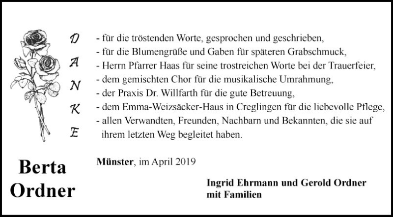 Hier finden Sie alle Traueranzeigen aus der Zeitung, die bisher für Berta Ordner erschienen sind. Weitere Traueranzeigen, die in der Zeitung erscheinen, werden hier ebenfalls aufgelistet