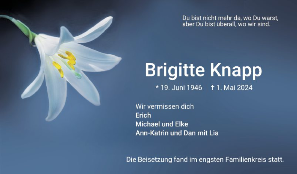Hier finden Sie alle Traueranzeigen aus der Zeitung, die bisher für Brigitte Knapp erschienen sind. Weitere Traueranzeigen, die in der Zeitung erscheinen, werden hier ebenfalls aufgelistet