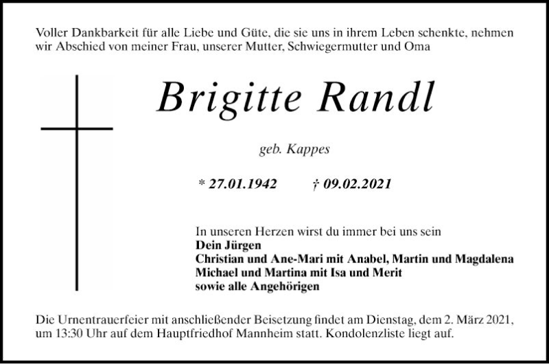 Hier finden Sie alle Traueranzeigen aus der Zeitung, die bisher für Brigitte Randl erschienen sind. Weitere Traueranzeigen, die in der Zeitung erscheinen, werden hier ebenfalls aufgelistet