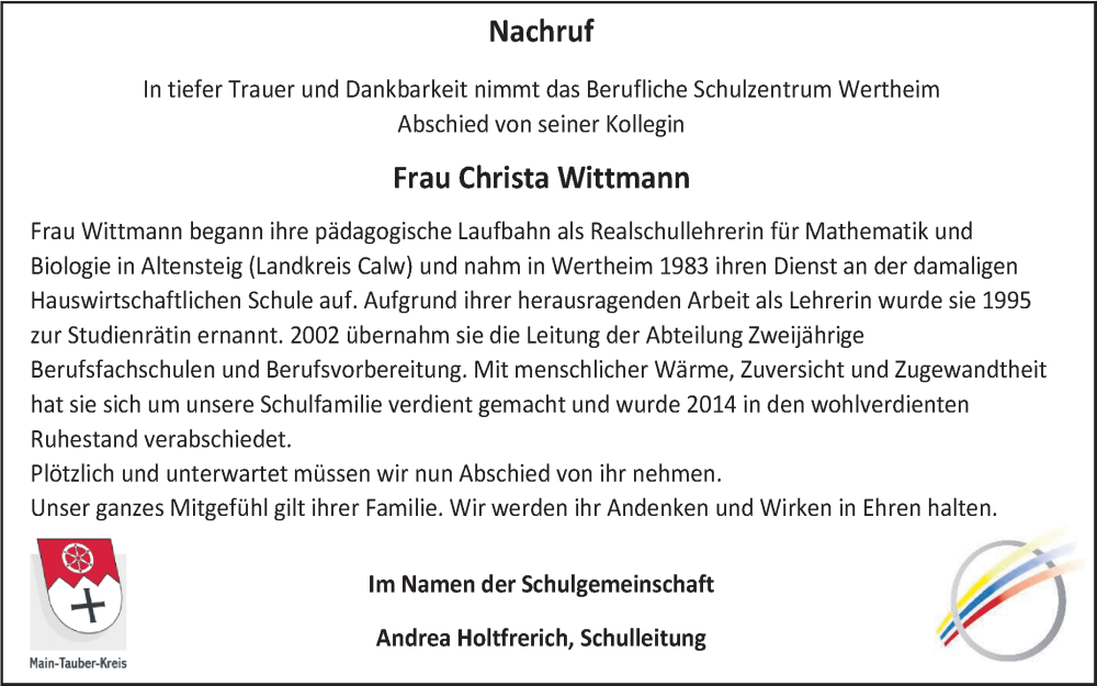 Hier finden Sie alle Traueranzeigen aus der Zeitung, die bisher für Christa Wittmann erschienen sind. Weitere Traueranzeigen, die in der Zeitung erscheinen, werden hier ebenfalls aufgelistet