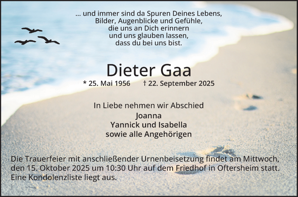 Hier finden Sie alle Traueranzeigen aus der Zeitung, die bisher für Dieter Gaa erschienen sind. Weitere Traueranzeigen, die in der Zeitung erscheinen, werden hier ebenfalls aufgelistet