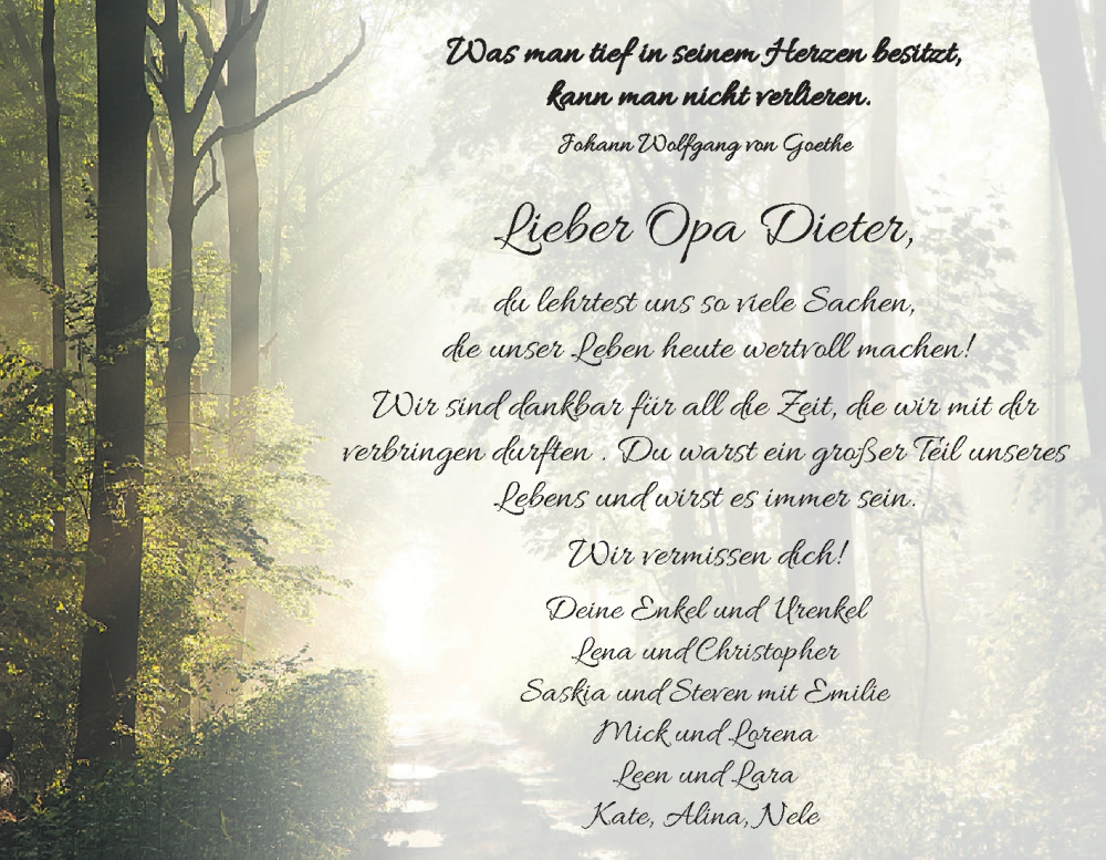 Hier finden Sie alle Traueranzeigen aus der Zeitung, die bisher für Dieter Pahl erschienen sind. Weitere Traueranzeigen, die in der Zeitung erscheinen, werden hier ebenfalls aufgelistet