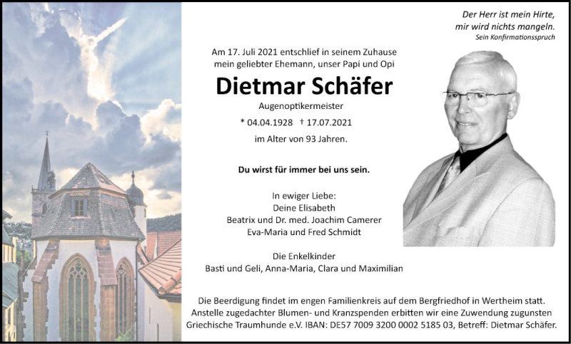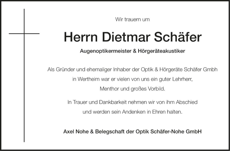 Hier finden Sie alle Traueranzeigen aus der Zeitung, die bisher für Dietmar Schäfer erschienen sind. Weitere Traueranzeigen, die in der Zeitung erscheinen, werden hier ebenfalls aufgelistet