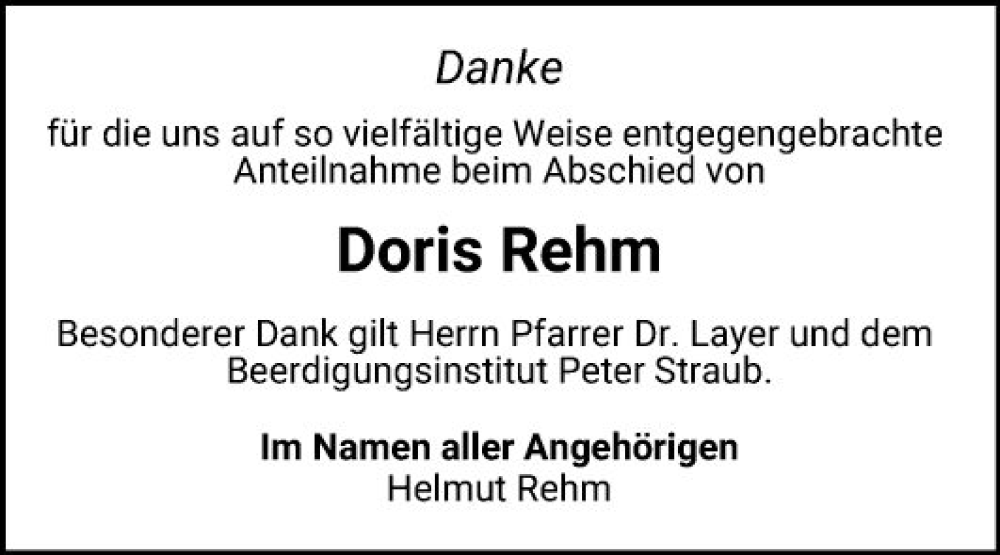 Hier finden Sie alle Traueranzeigen aus der Zeitung, die bisher für Doris Rehm erschienen sind. Weitere Traueranzeigen, die in der Zeitung erscheinen, werden hier ebenfalls aufgelistet
