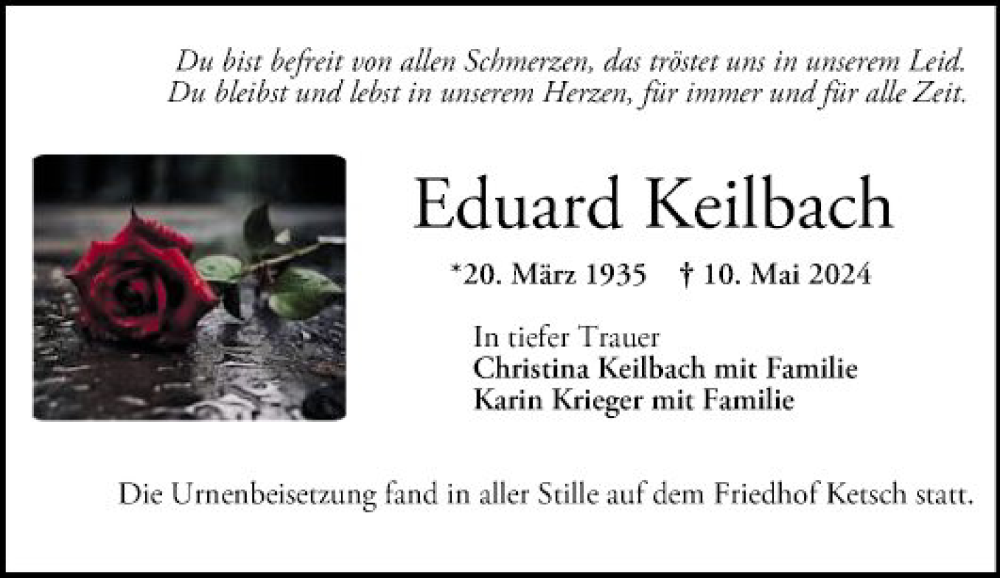 Hier finden Sie alle Traueranzeigen aus der Zeitung, die bisher für Eduard Keilbach erschienen sind. Weitere Traueranzeigen, die in der Zeitung erscheinen, werden hier ebenfalls aufgelistet