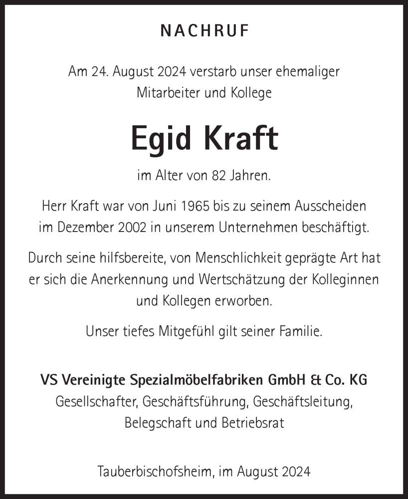 Hier finden Sie alle Traueranzeigen aus der Zeitung, die bisher für Egid Kraft erschienen sind. Weitere Traueranzeigen, die in der Zeitung erscheinen, werden hier ebenfalls aufgelistet