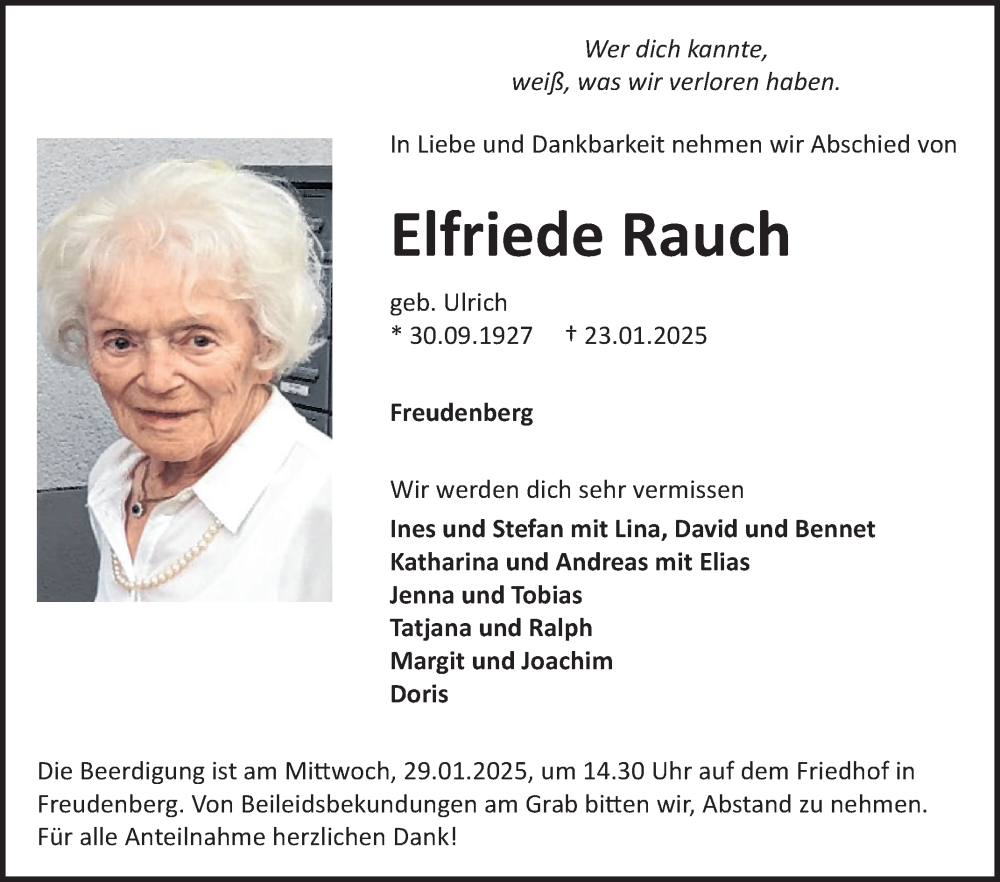 Hier finden Sie alle Traueranzeigen aus der Zeitung, die bisher für Elfriede Rauch erschienen sind. Weitere Traueranzeigen, die in der Zeitung erscheinen, werden hier ebenfalls aufgelistet