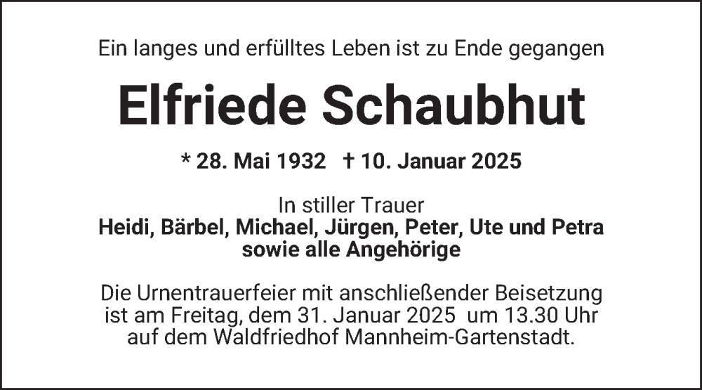 Hier finden Sie alle Traueranzeigen aus der Zeitung, die bisher für Elfriede Schaubhut erschienen sind. Weitere Traueranzeigen, die in der Zeitung erscheinen, werden hier ebenfalls aufgelistet