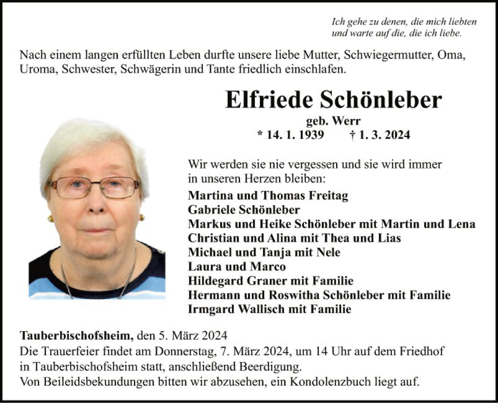 Hier finden Sie alle Traueranzeigen aus der Zeitung, die bisher für Elfriede Schönleber erschienen sind. Weitere Traueranzeigen, die in der Zeitung erscheinen, werden hier ebenfalls aufgelistet