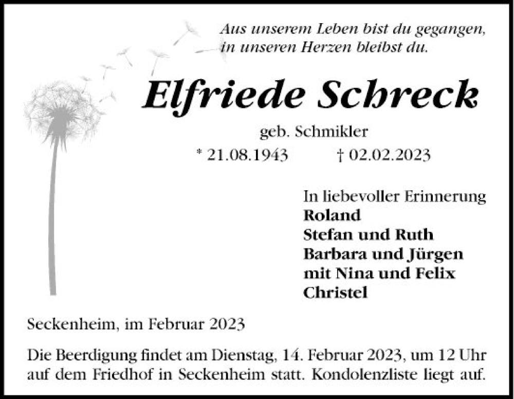 Hier finden Sie alle Traueranzeigen aus der Zeitung, die bisher für Elfriede Schreck erschienen sind. Weitere Traueranzeigen, die in der Zeitung erscheinen, werden hier ebenfalls aufgelistet