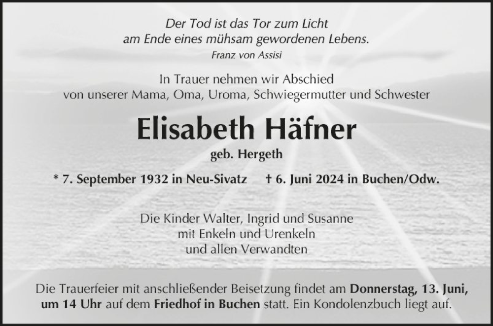 Hier finden Sie alle Traueranzeigen aus der Zeitung, die bisher für Elisabeth Häfner erschienen sind. Weitere Traueranzeigen, die in der Zeitung erscheinen, werden hier ebenfalls aufgelistet