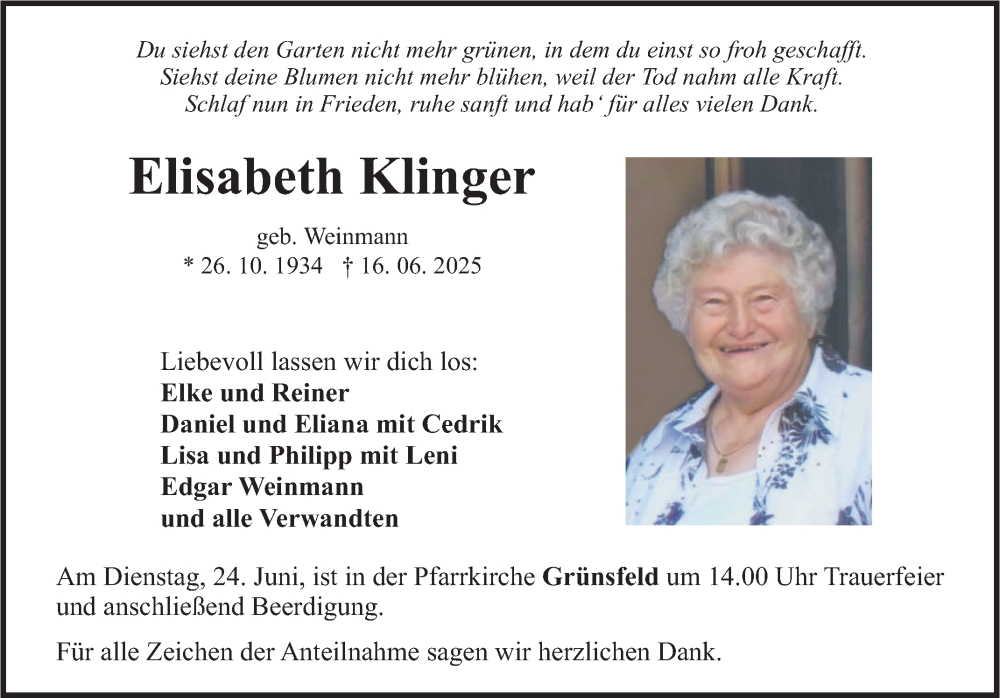 Hier finden Sie alle Traueranzeigen aus der Zeitung, die bisher für Elisabeth Klinger erschienen sind. Weitere Traueranzeigen, die in der Zeitung erscheinen, werden hier ebenfalls aufgelistet