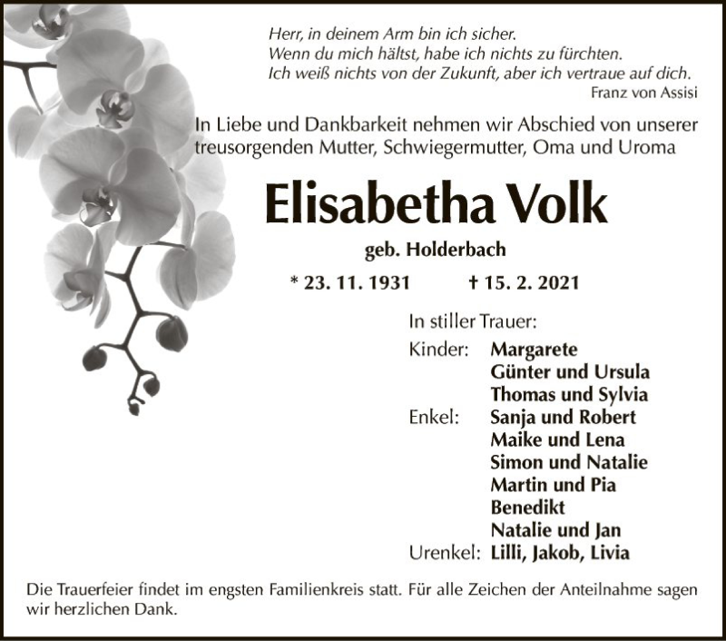 Hier finden Sie alle Traueranzeigen aus der Zeitung, die bisher für Elisabetha Vol erschienen sind. Weitere Traueranzeigen, die in der Zeitung erscheinen, werden hier ebenfalls aufgelistet