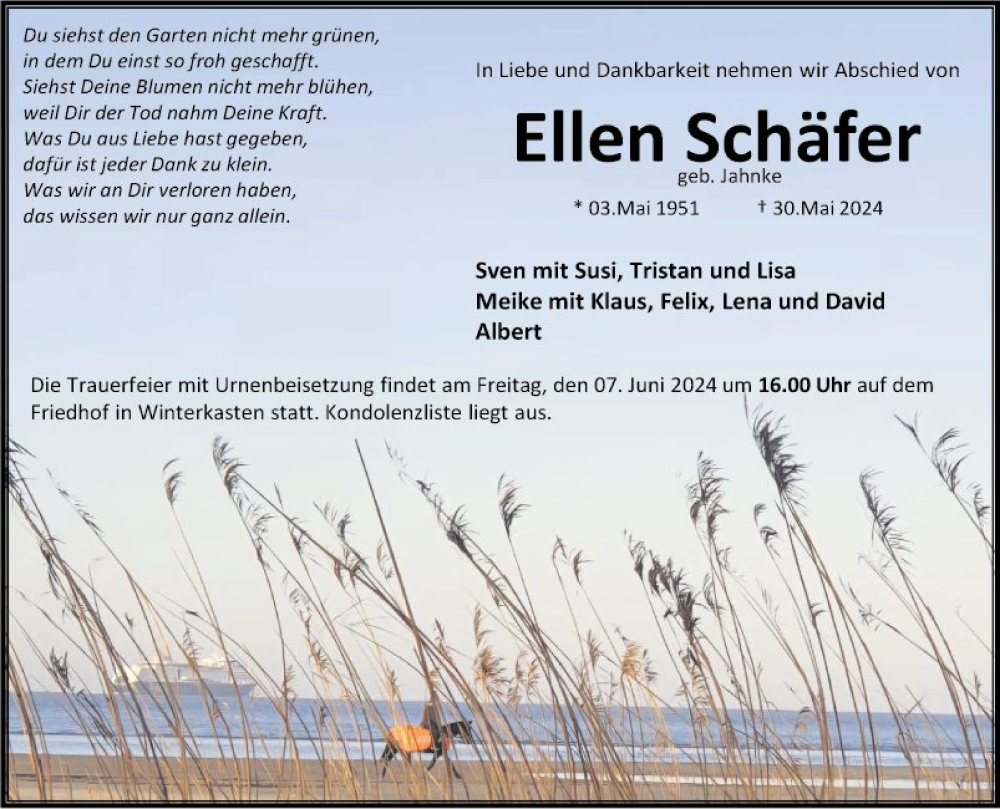 Hier finden Sie alle Traueranzeigen aus der Zeitung, die bisher für Ellen Schäfer erschienen sind. Weitere Traueranzeigen, die in der Zeitung erscheinen, werden hier ebenfalls aufgelistet