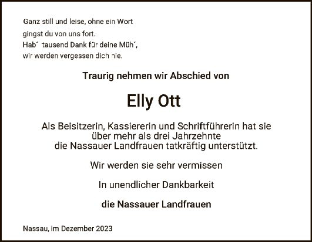 Hier finden Sie alle Traueranzeigen aus der Zeitung, die bisher für Elly Ott erschienen sind. Weitere Traueranzeigen, die in der Zeitung erscheinen, werden hier ebenfalls aufgelistet