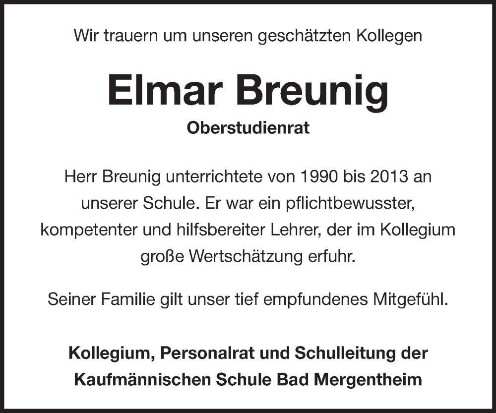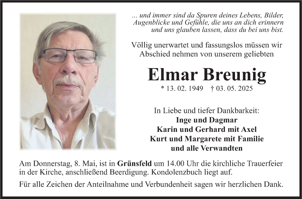 Hier finden Sie alle Traueranzeigen aus der Zeitung, die bisher für Elmar Breunig erschienen sind. Weitere Traueranzeigen, die in der Zeitung erscheinen, werden hier ebenfalls aufgelistet