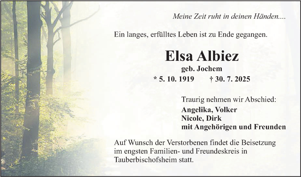 Hier finden Sie alle Traueranzeigen aus der Zeitung, die bisher für Elsa Albiez erschienen sind. Weitere Traueranzeigen, die in der Zeitung erscheinen, werden hier ebenfalls aufgelistet