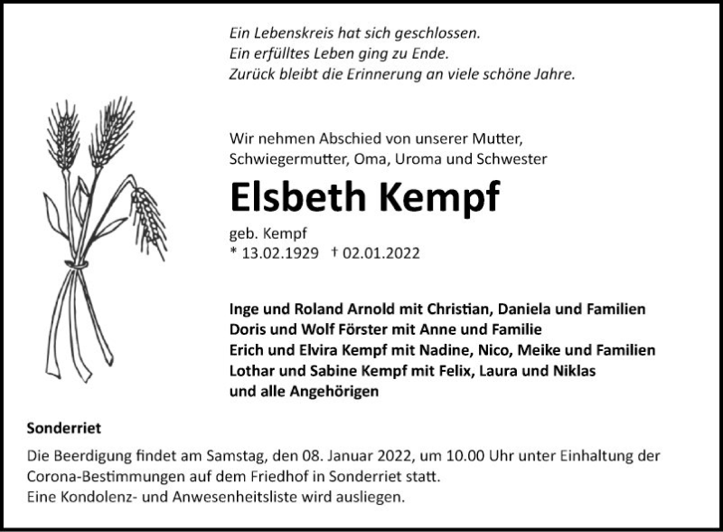Hier finden Sie alle Traueranzeigen aus der Zeitung, die bisher für Elsbeth Kempf erschienen sind. Weitere Traueranzeigen, die in der Zeitung erscheinen, werden hier ebenfalls aufgelistet