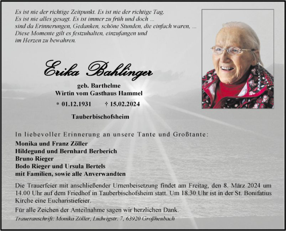 Hier finden Sie alle Traueranzeigen aus der Zeitung, die bisher für Erika Bahlinger erschienen sind. Weitere Traueranzeigen, die in der Zeitung erscheinen, werden hier ebenfalls aufgelistet