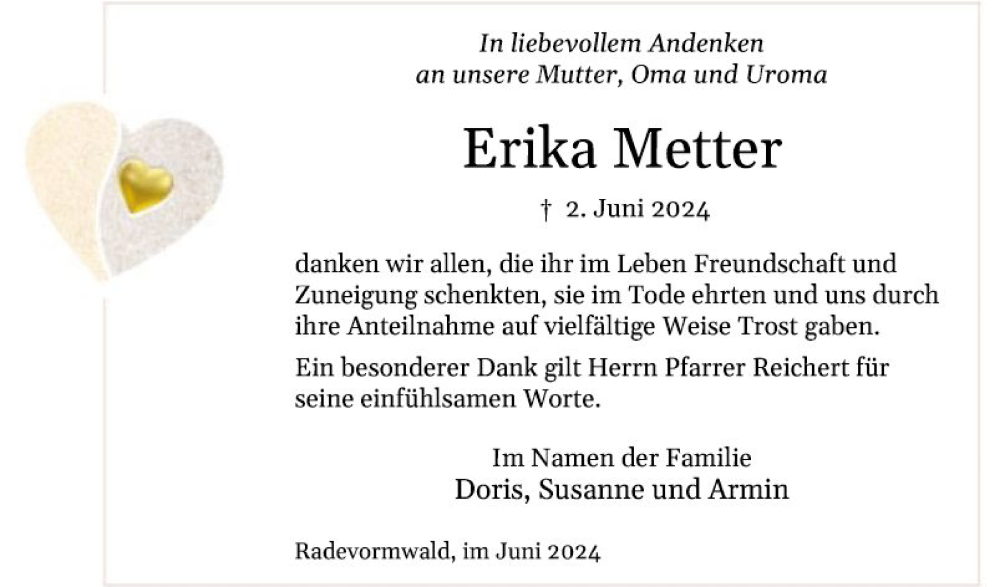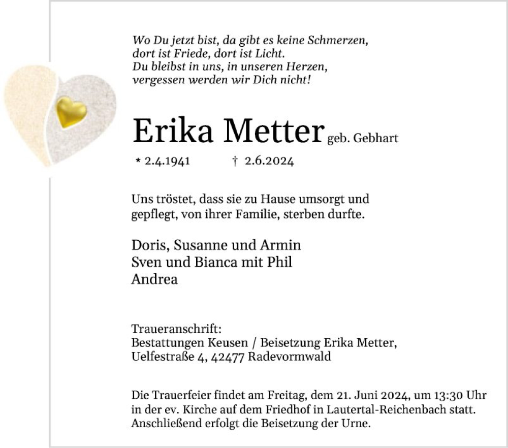 Hier finden Sie alle Traueranzeigen aus der Zeitung, die bisher für Erika Metter erschienen sind. Weitere Traueranzeigen, die in der Zeitung erscheinen, werden hier ebenfalls aufgelistet