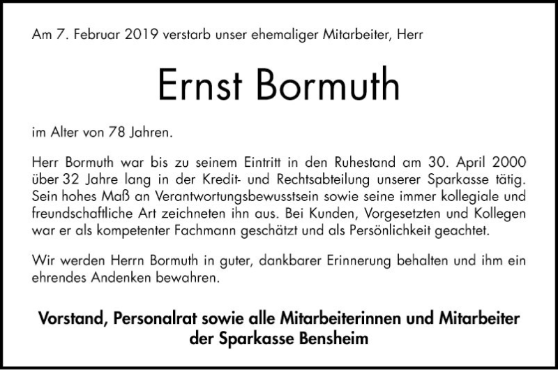 Hier finden Sie alle Traueranzeigen aus der Zeitung, die bisher für Ernst Bormuth erschienen sind. Weitere Traueranzeigen, die in der Zeitung erscheinen, werden hier ebenfalls aufgelistet