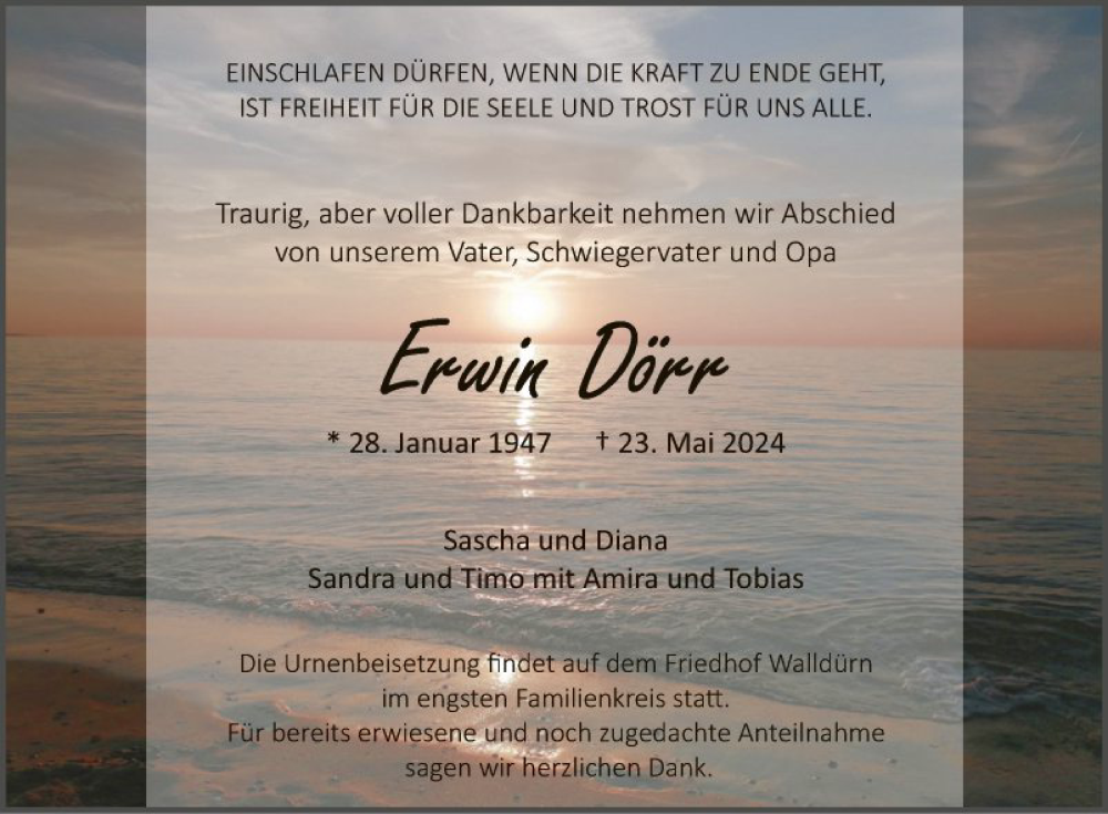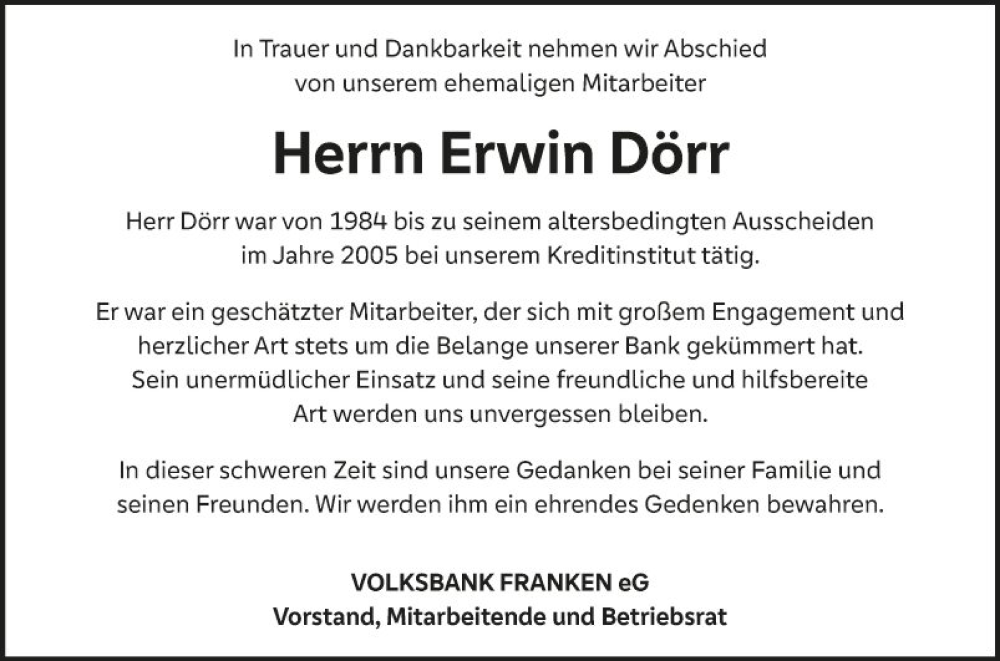 Hier finden Sie alle Traueranzeigen aus der Zeitung, die bisher für Erwin Dörr erschienen sind. Weitere Traueranzeigen, die in der Zeitung erscheinen, werden hier ebenfalls aufgelistet