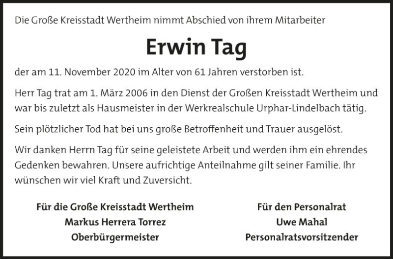 Hier finden Sie alle Traueranzeigen aus der Zeitung, die bisher für Erwin Tag erschienen sind. Weitere Traueranzeigen, die in der Zeitung erscheinen, werden hier ebenfalls aufgelistet