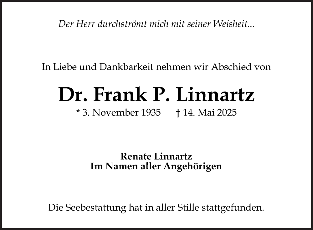 Hier finden Sie alle Traueranzeigen aus der Zeitung, die bisher für Frank Linnartz erschienen sind. Weitere Traueranzeigen, die in der Zeitung erscheinen, werden hier ebenfalls aufgelistet