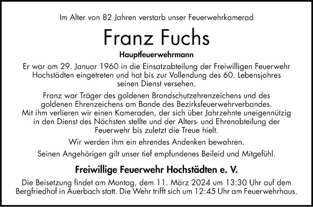 Hier finden Sie alle Traueranzeigen aus der Zeitung, die bisher für Franz Fuchs erschienen sind. Weitere Traueranzeigen, die in der Zeitung erscheinen, werden hier ebenfalls aufgelistet