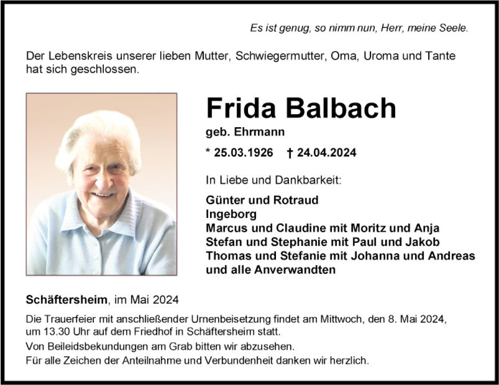 Hier finden Sie alle Traueranzeigen aus der Zeitung, die bisher für Frida Balbach erschienen sind. Weitere Traueranzeigen, die in der Zeitung erscheinen, werden hier ebenfalls aufgelistet