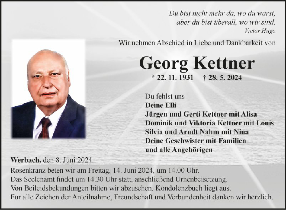 Hier finden Sie alle Traueranzeigen aus der Zeitung, die bisher für Georg Kettner erschienen sind. Weitere Traueranzeigen, die in der Zeitung erscheinen, werden hier ebenfalls aufgelistet