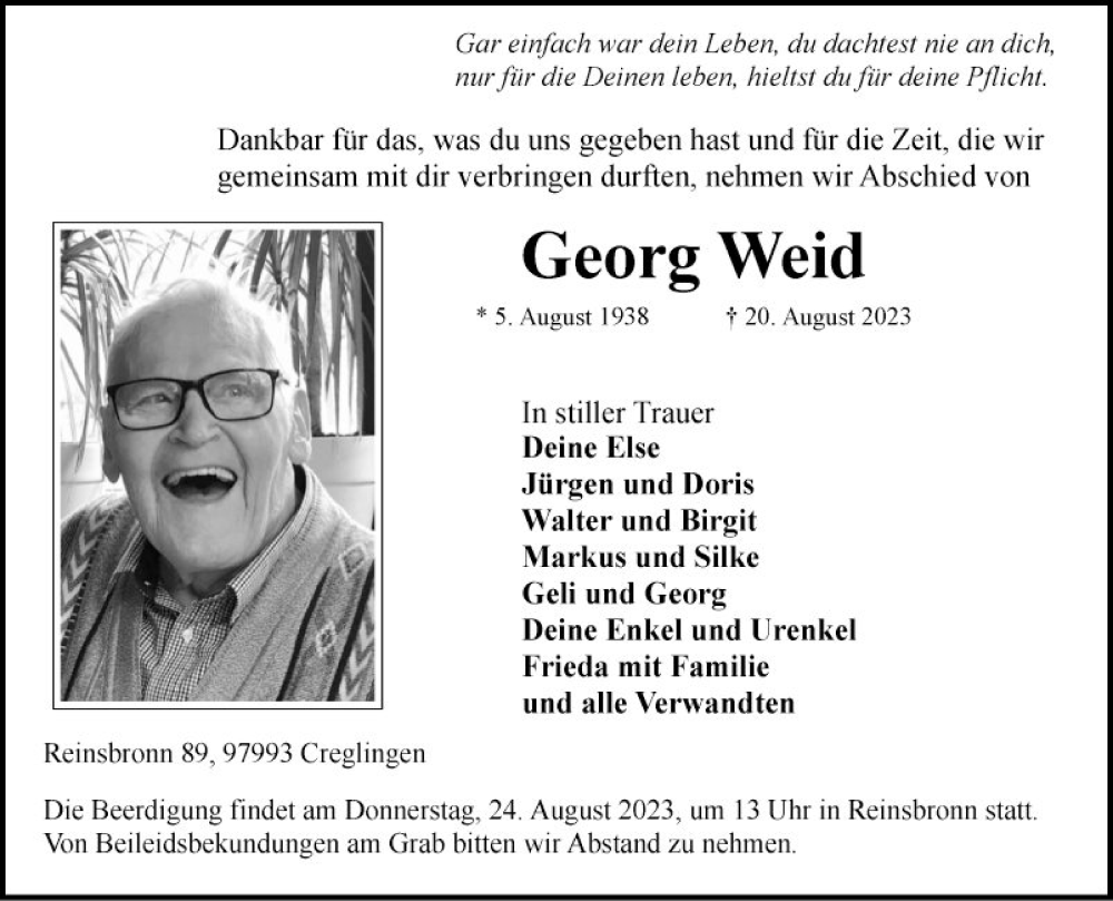 Hier finden Sie alle Traueranzeigen aus der Zeitung, die bisher für Georg Weid erschienen sind. Weitere Traueranzeigen, die in der Zeitung erscheinen, werden hier ebenfalls aufgelistet