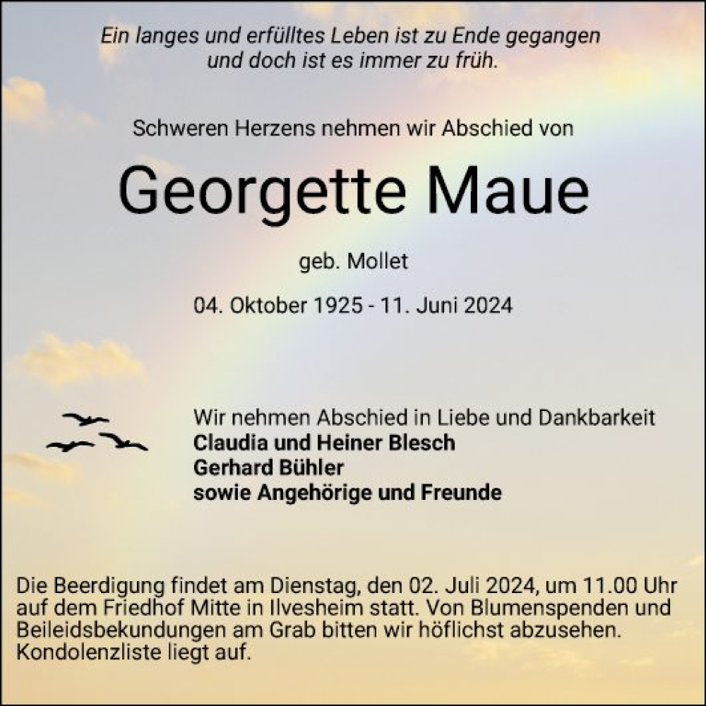 Hier finden Sie alle Traueranzeigen aus der Zeitung, die bisher für Georgette Maue erschienen sind. Weitere Traueranzeigen, die in der Zeitung erscheinen, werden hier ebenfalls aufgelistet