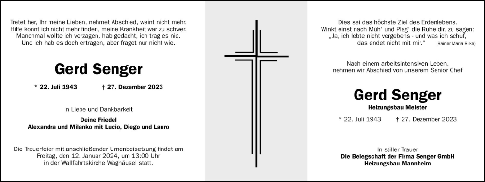 Hier finden Sie alle Traueranzeigen aus der Zeitung, die bisher für Gerd Senger erschienen sind. Weitere Traueranzeigen, die in der Zeitung erscheinen, werden hier ebenfalls aufgelistet